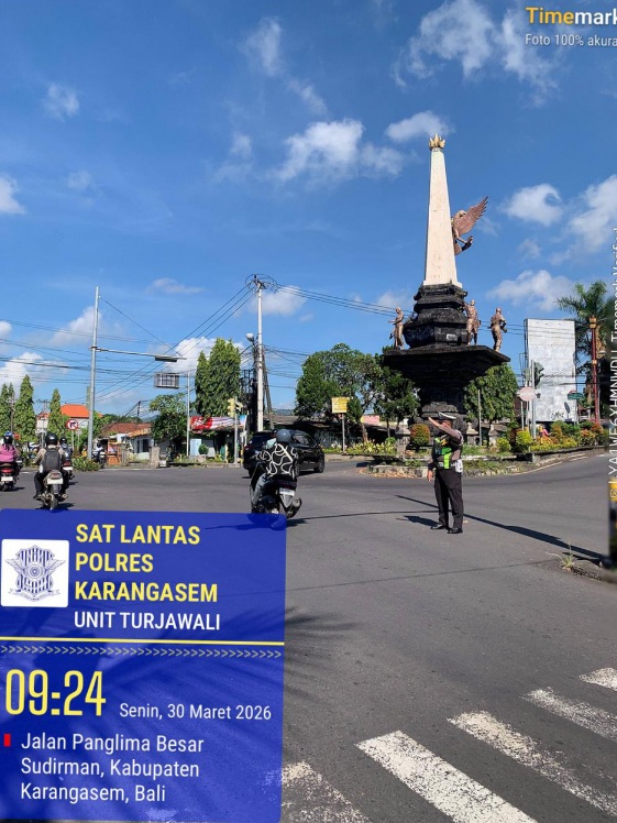 Guna memastikan serta menjaga kelancaran arus lalu lintas di seputaran Ktl 2 simpang tiga Kodim personil satuan Lalu Lintas Polres Karangasem melaksanakan pemantauan, pengaturan dan penjagaan dipos Ktl 2 simpang tiga Kodim. Pada hari Senin, 30 Maret 2026 pukul 09.30 Wita.