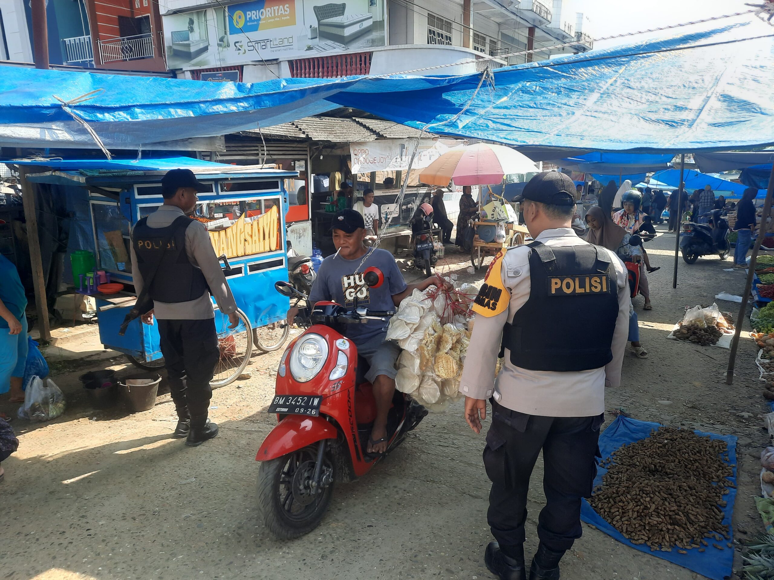 Polisi menyusuri lapak-lapak pedagang sambil menyapa warga dengan ramah. Mereka mengingatkan masyarakat agar tetap waspada terhadap aksi kriminal, terutama di tempat keramaian seperti pasar.
