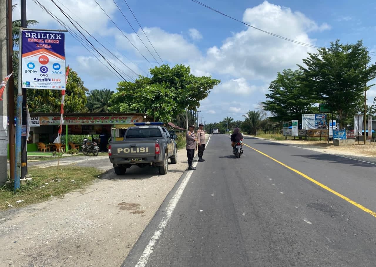Polsek Pangkalan Lesung, Polres Pelalawan, melaksanakan patroli rutin dan pengaturan lalu lintas di Jalan Lintas Timur, Kecamatan Pangkalan Lesung, Sabtu, 20 Desember 2025.