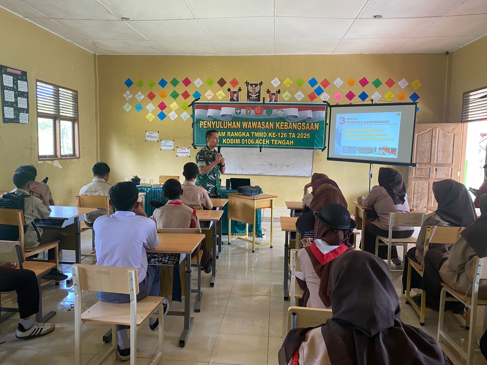 Anggota Satuan Tugas (Satgas) Tentara Manunggal Membangun Desa (TMMD) ke-126, Kodim 0106/Aceh Tengah memberikan penyuluhan Wawasan Kebangsaan (Wasbang) kepada siswa-siswi SMA Negeri 18 desa kute keramil Kecamatan Linge, Kabupaten Aceh Tengah, pada Sabtu (11/10/2025).