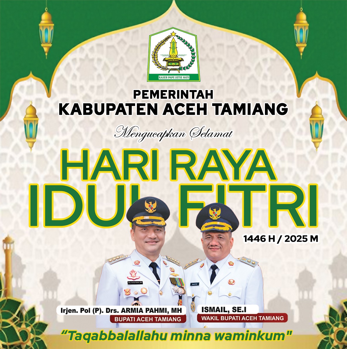 Bupati Aceh Tamiang., Irjen. Pol (P). Drs. Armia Pahmi., MH., beserta Wakil Bupati Aceh Tamiang, Ismail., SE.I., Minal Aldain Walfaidain Mohon Maaf Lahir dan Batin.”