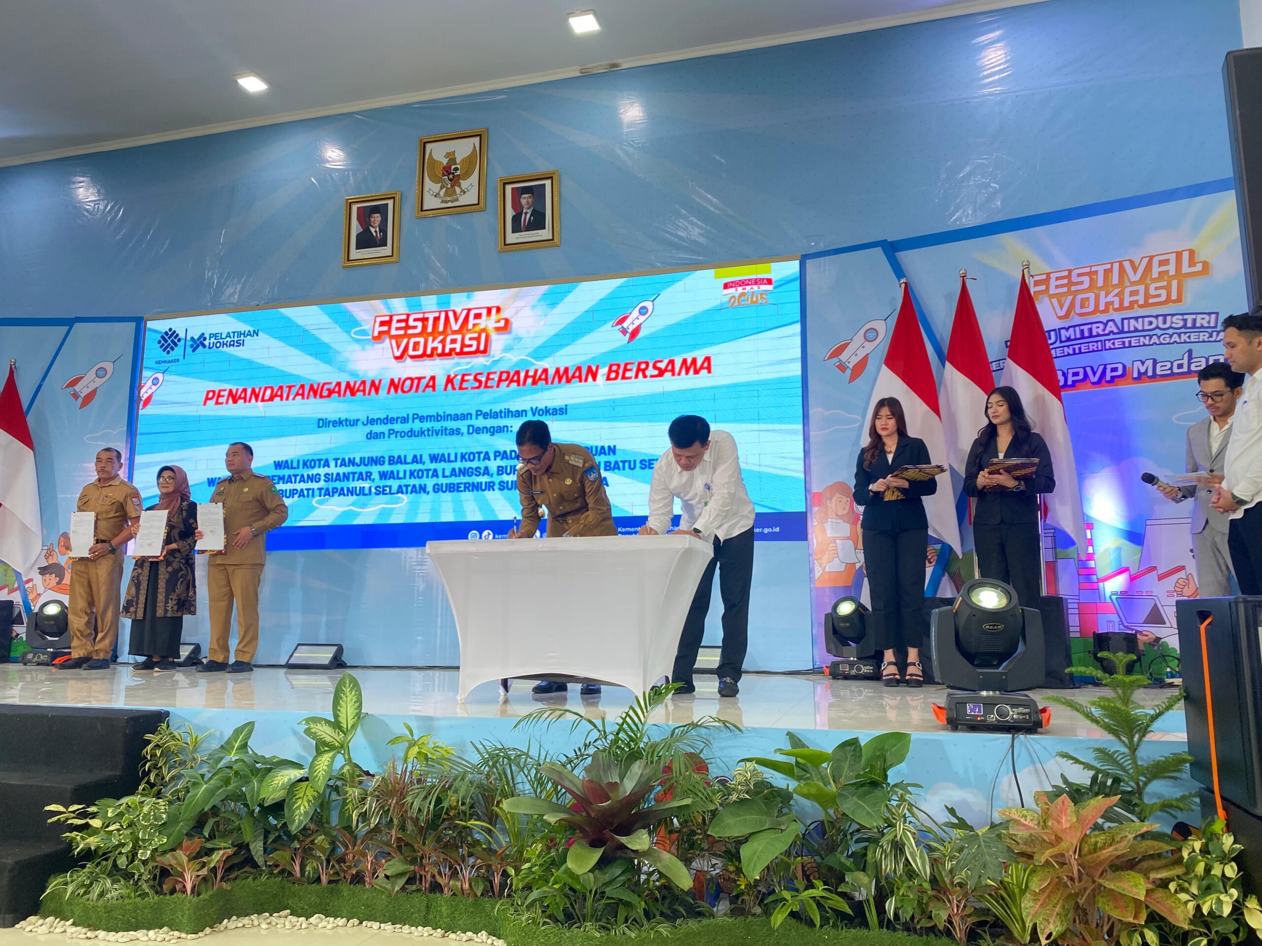 Nota kesepakatan ditandatangani Pj Walikota Langsa Dr. Syaridin, S.Pd., M.Pd dan Direktur Jenderal Pembinaan Pelatihan Vokasi dan Produktivitas Kementerian Ketenagakerjaan Republik Indonesia Agung Nur Rohmad, S.T, M.M di balai pelatihan vokasi dan produktivitas Medan, Sumatera Utara, Senin, (23/12/24).