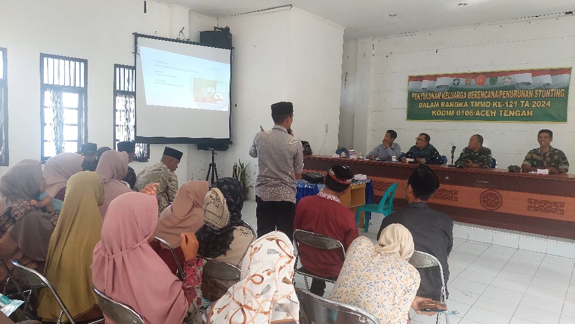 Satgas TMMD Satgas TMMD Reguler 121 Kodim 0106/Ateng berikan sosialisasi penyuluhan KB dan penurunan stanting, bekerja sama dengan dinas kesehatan bertempat di gedung aula Camat Kec Bintang Kab, Aceh Tengah. Senin (12/08/24)