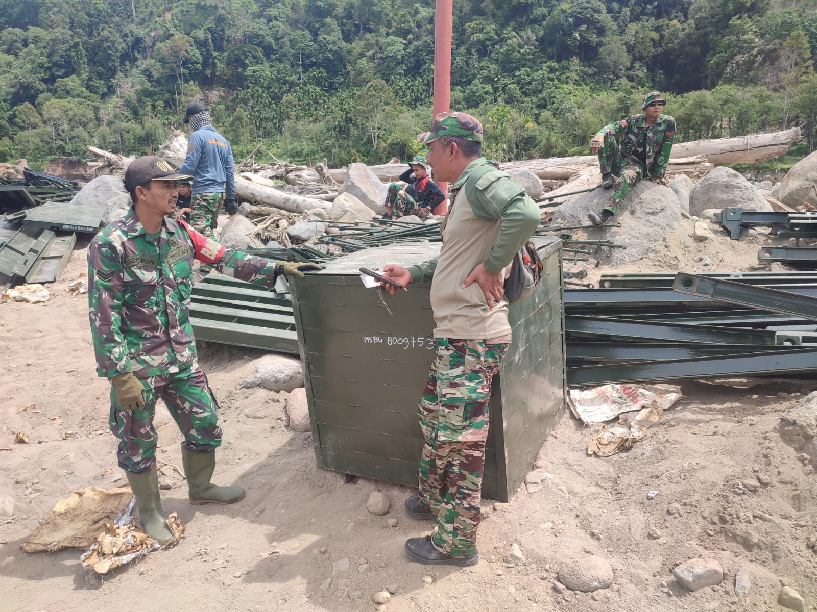 Personel Satuan Tugas Gulbencal, Sertu Sopian, melaksanakan kegiatan pengecekan material jembatan Bailey bersama personel Yon Zipur 16/DA yang dipimpin Dpp Pelda Andar. Kegiatan tersebut dilakukan sebagai bagian dari persiapan pemasangan jembatan Bailey di Dusun Ayun, Kecamatan Ketol, Kabupaten Aceh Tengah.