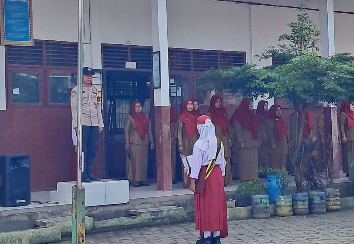 Jajaran Polsek Pangkalan Kuras melaksanakan kegiatan Police Go To School yang dirangkaikan dengan pelaksanaan upacara bendera di SD Negeri 006 Desa Sorek Dua, Kecamatan Pangkalan Kuras, Kabupaten Pelalawan, Senin pagi, 20 Oktober 2025.