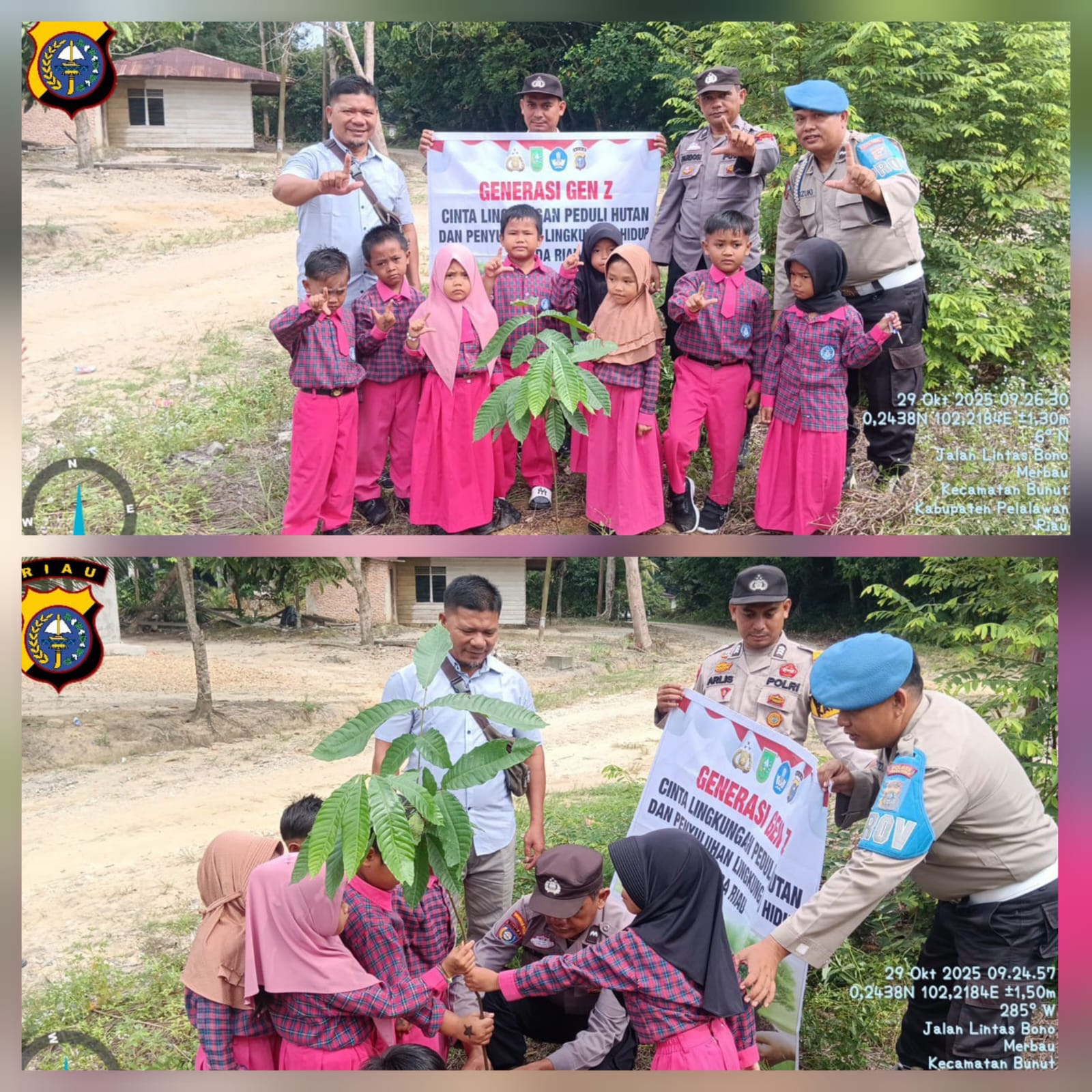 Polsek Bunut, Polres Pelalawan, melaksanakan kegiatan penanaman bibit pohon di halaman TK AL Bainur, Desa Merbau, Kecamatan Bunut, Rabu (29/10/2025) pukul 09.00 WIB. Kegiatan ini merupakan bagian dari program penghijauan lingkungan dan kelestarian alam yang didukung Kapolda Riau.