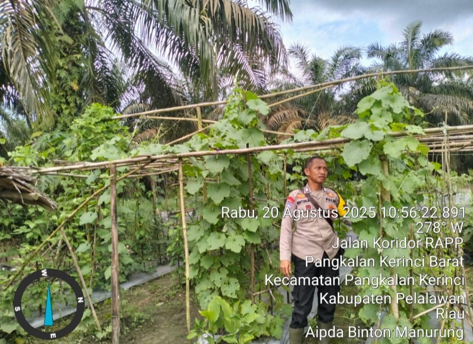 Guna memperkuat ketahanan pangan di tingkat rumah tangga, Bhabinkamtibmas Kelurahan Pangkalan Kerinci Barat, Aipda Binton Manurung, melakukan monitoring program pemanfaatan lahan pekarangan di kebun milik warga bernama Pak Ndut, yang berlokasi di RT 03 RW 06, Rabu (20/8).