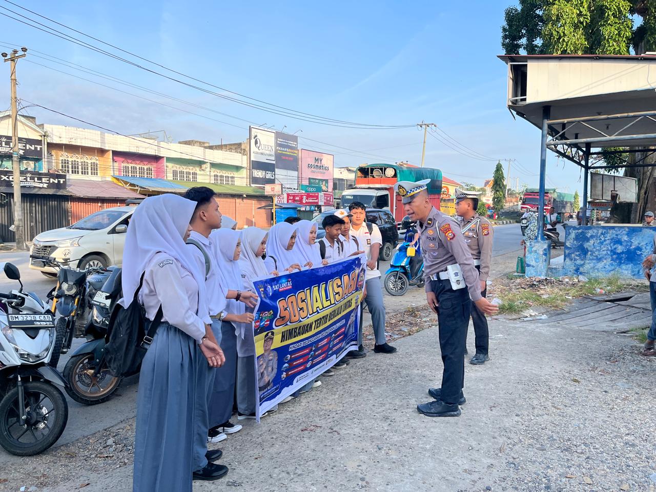 Kepolisian Sektor Pangkalan Kuras menggelar sosialisasi himbauan tertib berlalu lintas kepada masyarakat di Jalan Lintas Timur Km 113 Simpang Beringin, Kelurahan Sorek Satu, Kecamatan Pangkalan Kuras, Kabupaten Pelalawan, Riau, Senin pagi, 26 Januari 2026.