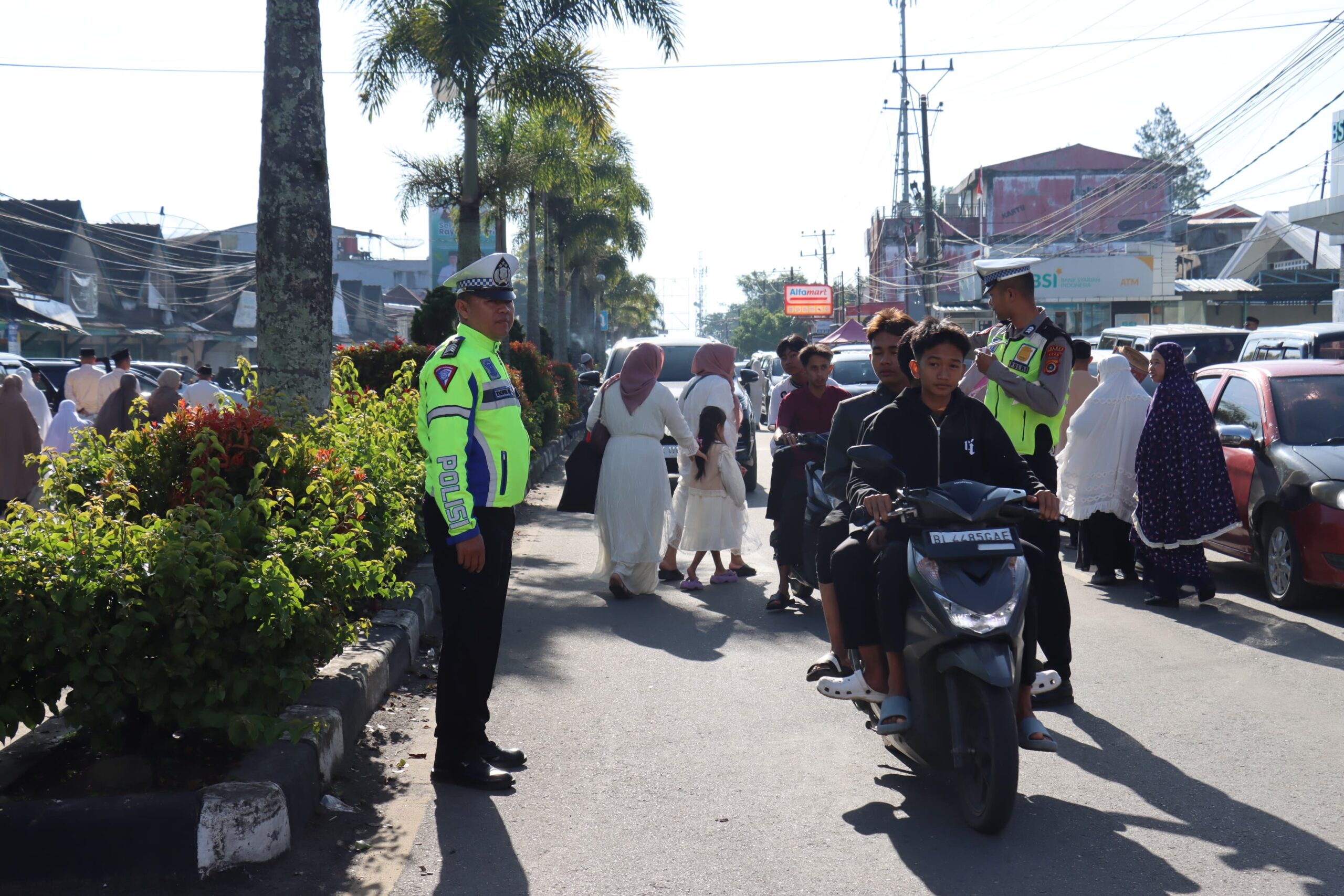 Selain fokus pada pengamanan, petugas juga melakukan pengaturan lalu lintas guna mengantisipasi kepadatan kendaraan, khususnya di area yang menjadi pusat pelaksanaan Shalat Id.