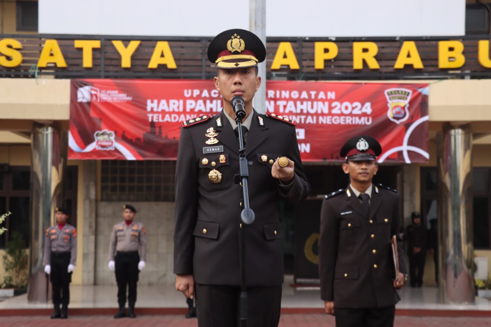 Dalam amanatnya Kapolres Cilegon Polda Banten AKBP Kemas Indra Natanagara dengan tema peringatan Hari Pahlawan Tahun 2024 adalah “Teladani Pahlawanmu, Cintai Negerimu”. Tema ini mengandung makna yang dalam. “Teladani Pahlawanmu”, berarti bahwa semua olah pikiran dan perbuatan harus senantiasa diilhami oleh semangat kepahlawanan. Adapun “Cintai Negerimu” mengandung makna bahwa apapun bentuk pengabdian kita harus memberikan sumbangsih yang berarti bagi kemajuan bangsa Indonesia. Terlebih dalam situasi global yang sukar diprediksi ini maka mencintai negeri adalah juga dengan memperkuat jalinan kesetiakawanan sosial, memperkuat persatuan dan solidaritas sosial, menghidupkan kembali nilai sosial persaudaraan sesama anak bangsa.