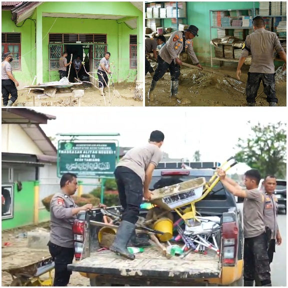Sebagai bentuk kepedulian terhadap dunia pendidikan pascabencana banjir, Polres Langsa bersama masyarakat melaksanakan kegiatan bhakti sosial berupa gotong royong membersihkan lingkungan sekolah yang terdampak banjir di wilayah Kabupaten Aceh Tamiang, pada Kamis, (25/12/2025).