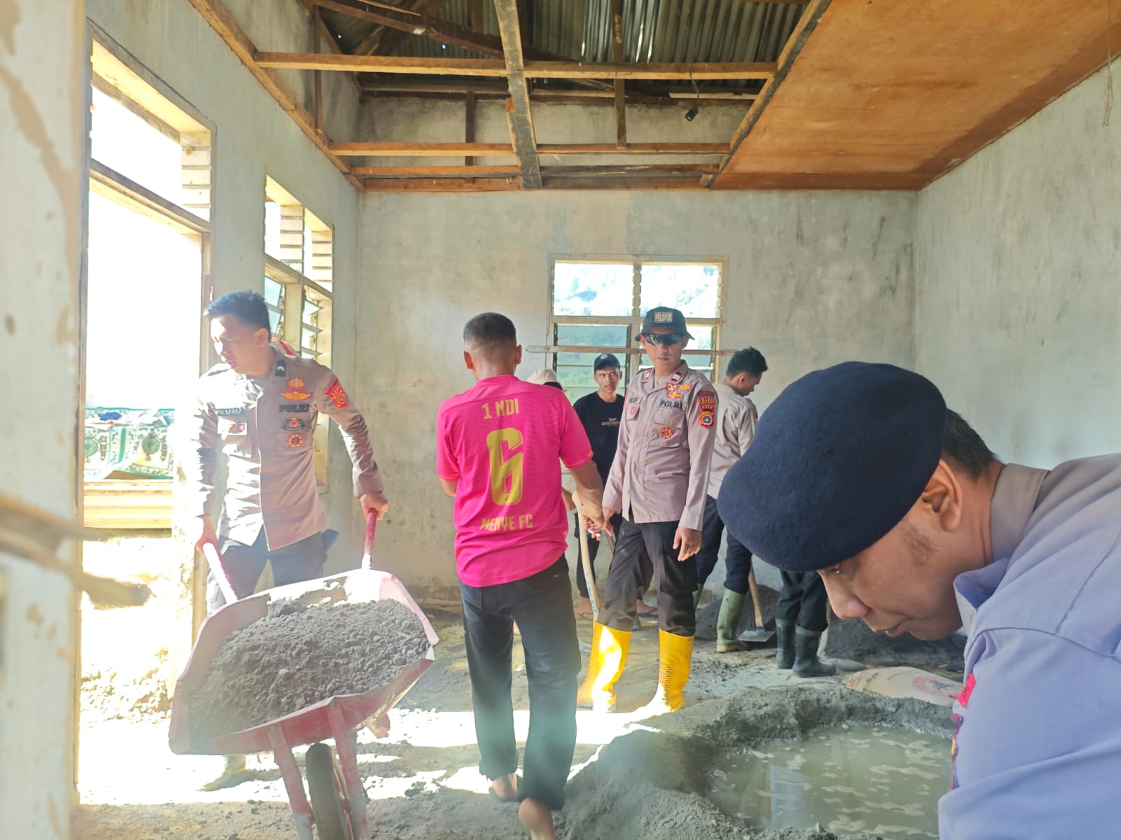 Jajaran Kepolisian Resor Aceh Tengah bersama Mahasiswa STIK-PTIK Angkatan 83 Lemdikkat Polri, BKO Brimob Polda Aceh, serta jajaran Polsek melaksanakan kegiatan gotong royong pemulihan fasilitas umum dan tempat ibadah di tiga lokasi wilayah Kabupaten Aceh Tengah, Jumat pagi (13/2/2026).