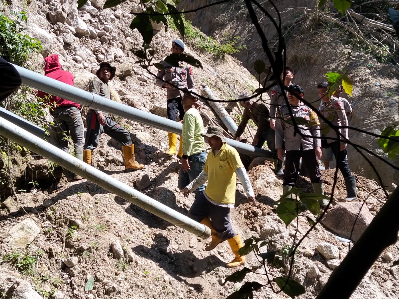 Akibat longsor yang terjadi sebelumnya, pipa air mengalami kerusakan cukup parah sehingga mengganggu distribusi air bersih bagi masyarakat. Melalui semangat kebersamaan dan gotong royong, personel Polsek Ketol, Brimob, serta masyarakat setempat bahu membahu mengangkat dan memasang pipa, melewati medan perbukitan dan lereng gunung.
