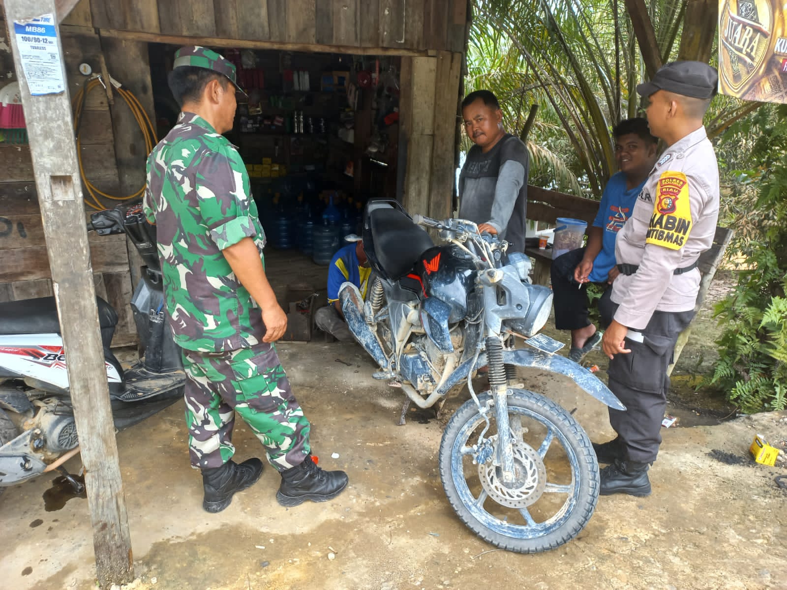 Personel Polsek Langgam melaksanakan kegiatan sinergitas bersama TNI Koramil 09 Langgam di Jalan Koridor RAPP KM 40, Desa Segati, Kecamatan Langgam, Kabupaten Pelalawan, Minggu, 15 Maret 2026.