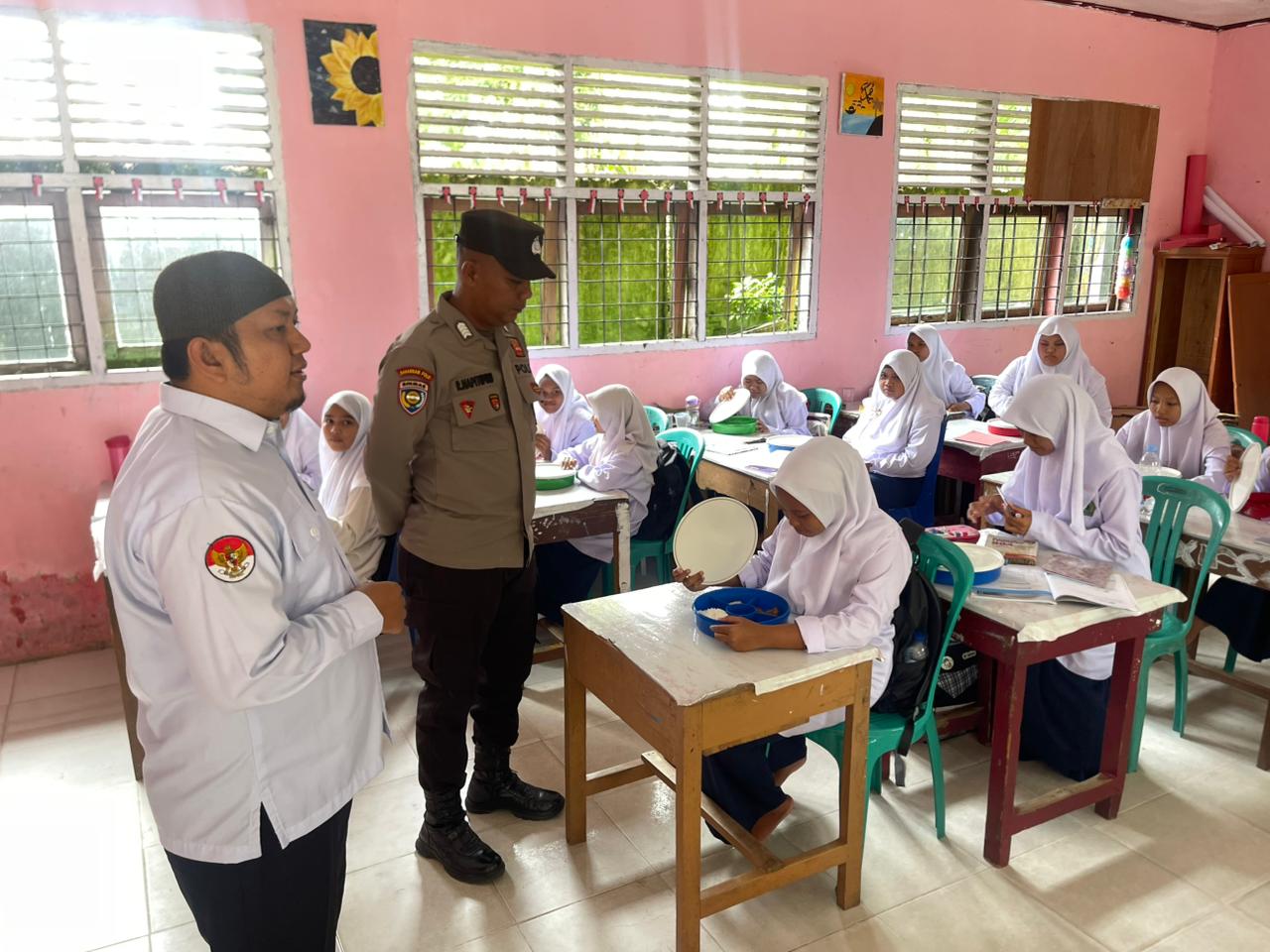 Personel Polsek Pangkalan Kuras melakukan pengawasan terhadap program Pemberian Makan Bergizi Gratis (MBG) yang telah memasuki hari ke-15 di MTs Al-Qasimiyah dan SMPN 1, Kelurahan Sorek Satu, Kecamatan Pangkalan Kuras, Kabupaten Pelalawan.