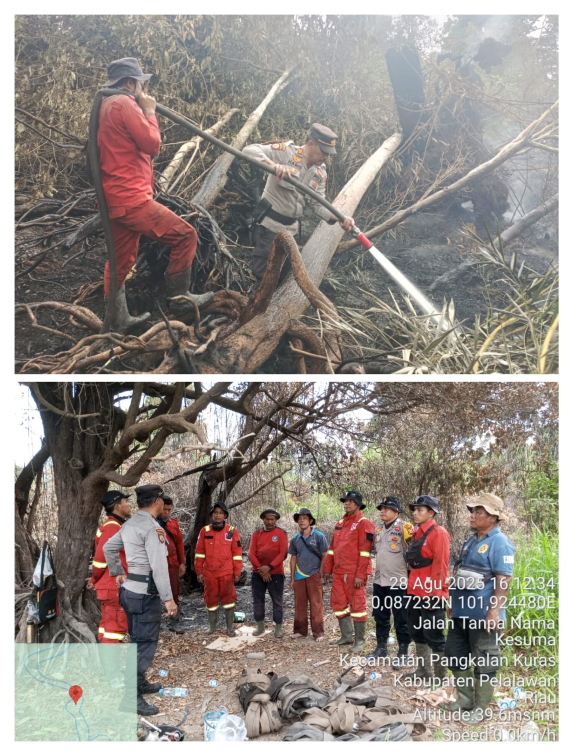 Tim Gabungan Pemburu Karhutla dari Polsek Pangkalan Kuras melakukan giat pendinginan pada lokasi bekas lahan terbakar yang tidak terpantau oleh aplikasi Dashboard Lancang Kuning (DLK). Operasi ini dilakukan sebagai tindak lanjut dari laporan Regu Patroli Pantau Api milik PT Surya Bratasena Plantation (SBP) yang mendeteksi adanya sisa kebakaran di wilayah Desa Kesuma, Kecamatan Pangkalan Kuras, Kabupaten Pelalawan.