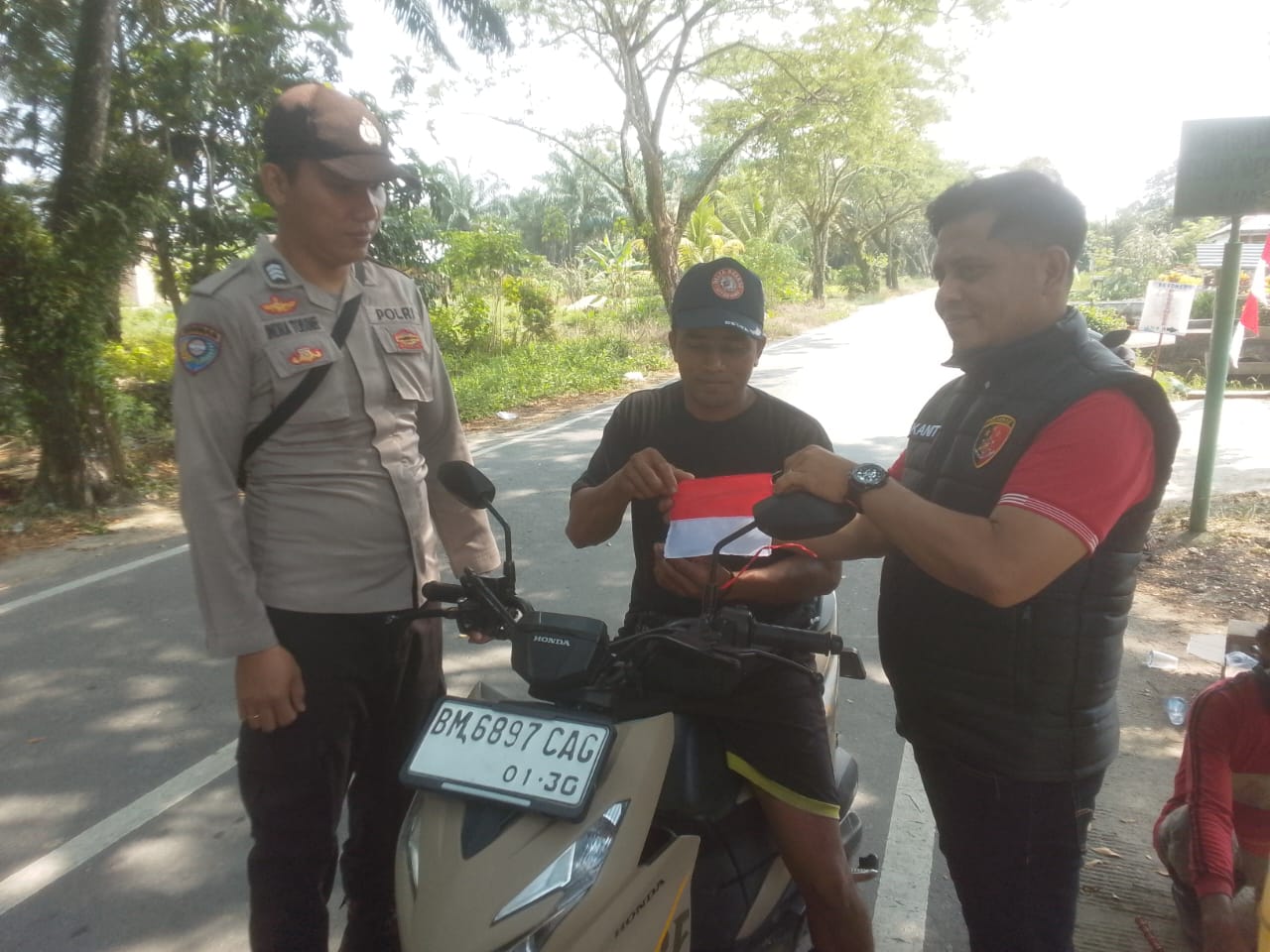 Personel Polsek secara langsung membagikan bendera merah putih dan memasangnya pada kendaraan roda dua dan roda empat yang melintas sebagai bentuk dukungan dan semangat nasionalisme menjelang perayaan kemerdekaan.