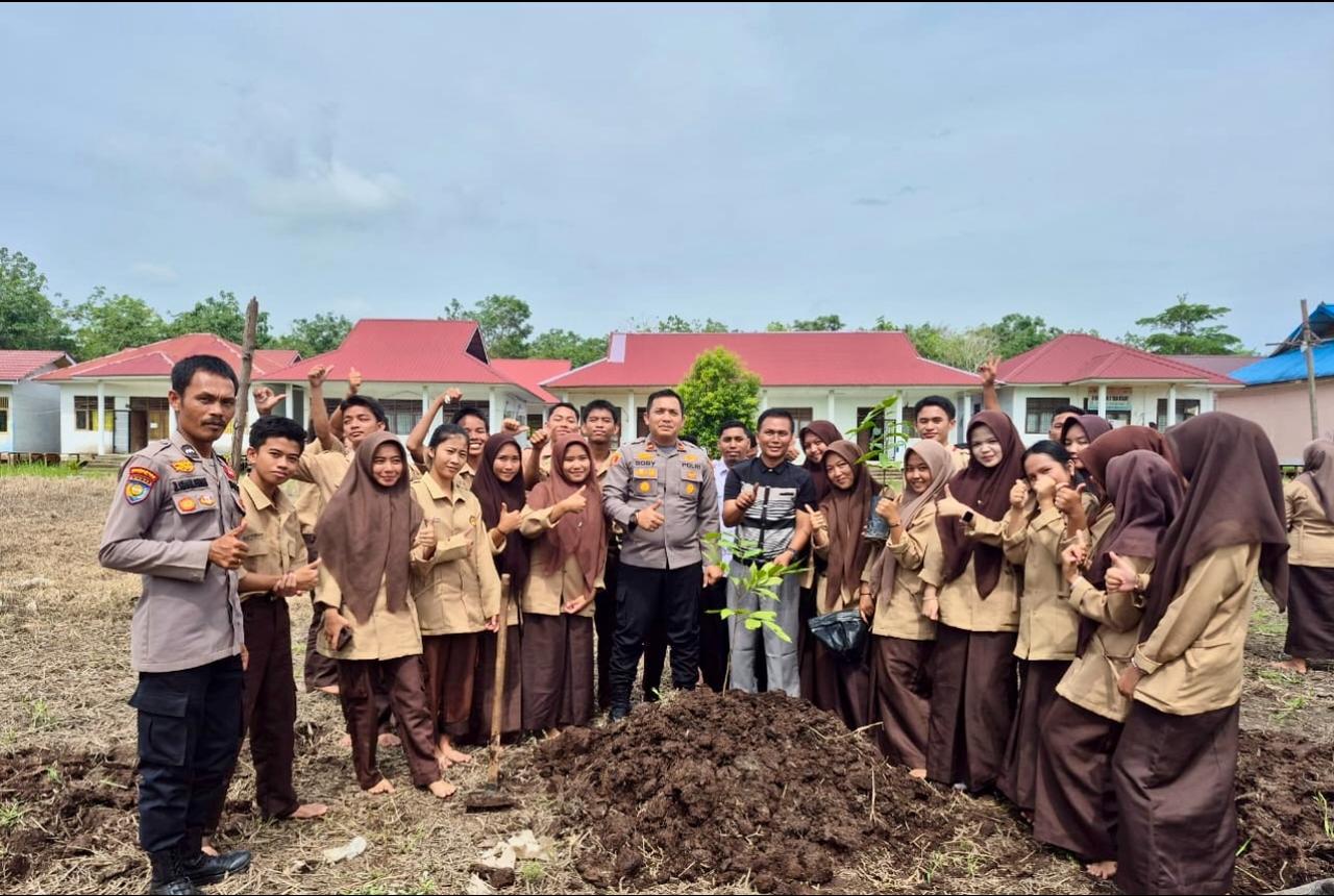 Polsek Teluk Meranti melaksanakan kegiatan penanaman bibit pohon di halaman SMA Negeri 3 Teluk Meranti, Desa Kuala Panduk, Kecamatan Teluk Meranti, Senin (9/2/2026) pagi.