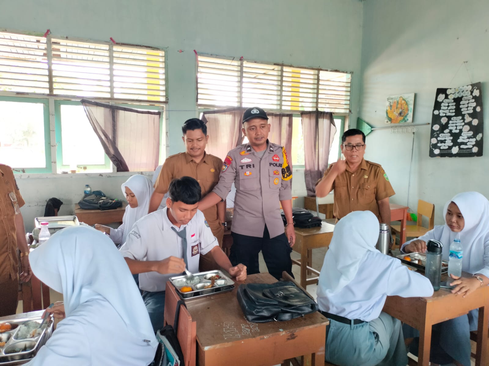 Bhabinkamtibmas Desa Ukui Dua, Aipda Tri Kurniawan Putro, S.H., hadir bersama kepala sekolah dan unsur pemerintahan desa untuk memastikan distribusi makanan tepat sasaran dan mendukung kesehatan serta prestasi belajar para pelajar.
