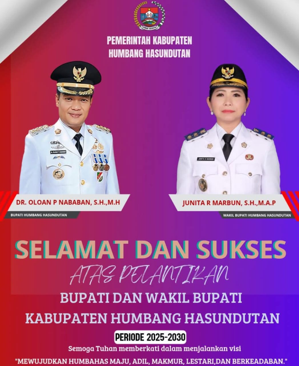 Presiden RI Prabowo Subianto lantik dan mengambil sumpah jabatan Bupati-Wakil Bupati Humbahas (Humbang Hasundutan) Sumut periode 2025-2030 Dr. Oloan P. Nababan S.H, M.H-Junita Rebeka Marbun S.H, M.AP, Rabu 20 Februari 2025 di Istana Kepresidenan Jakarta.