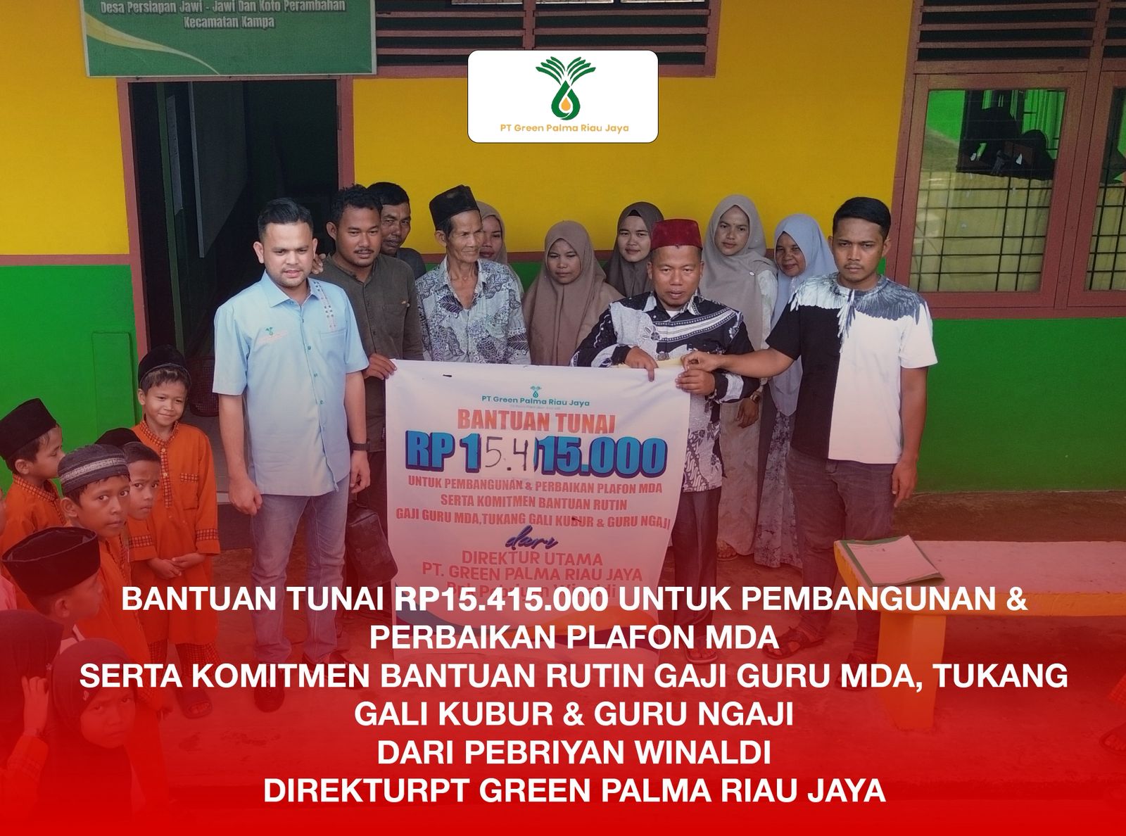 Penyerahan bantuan dilakukan langsung oleh Direktur Utama PT Green Palma Riau Jaya, Pebriyan Winaldi, dan diterima oleh Syafrizon, Kepala MDA Desa Persiapan Jawi–Jawi, disaksikan para guru, tokoh masyarakat, serta murid-murid MDA setempat.