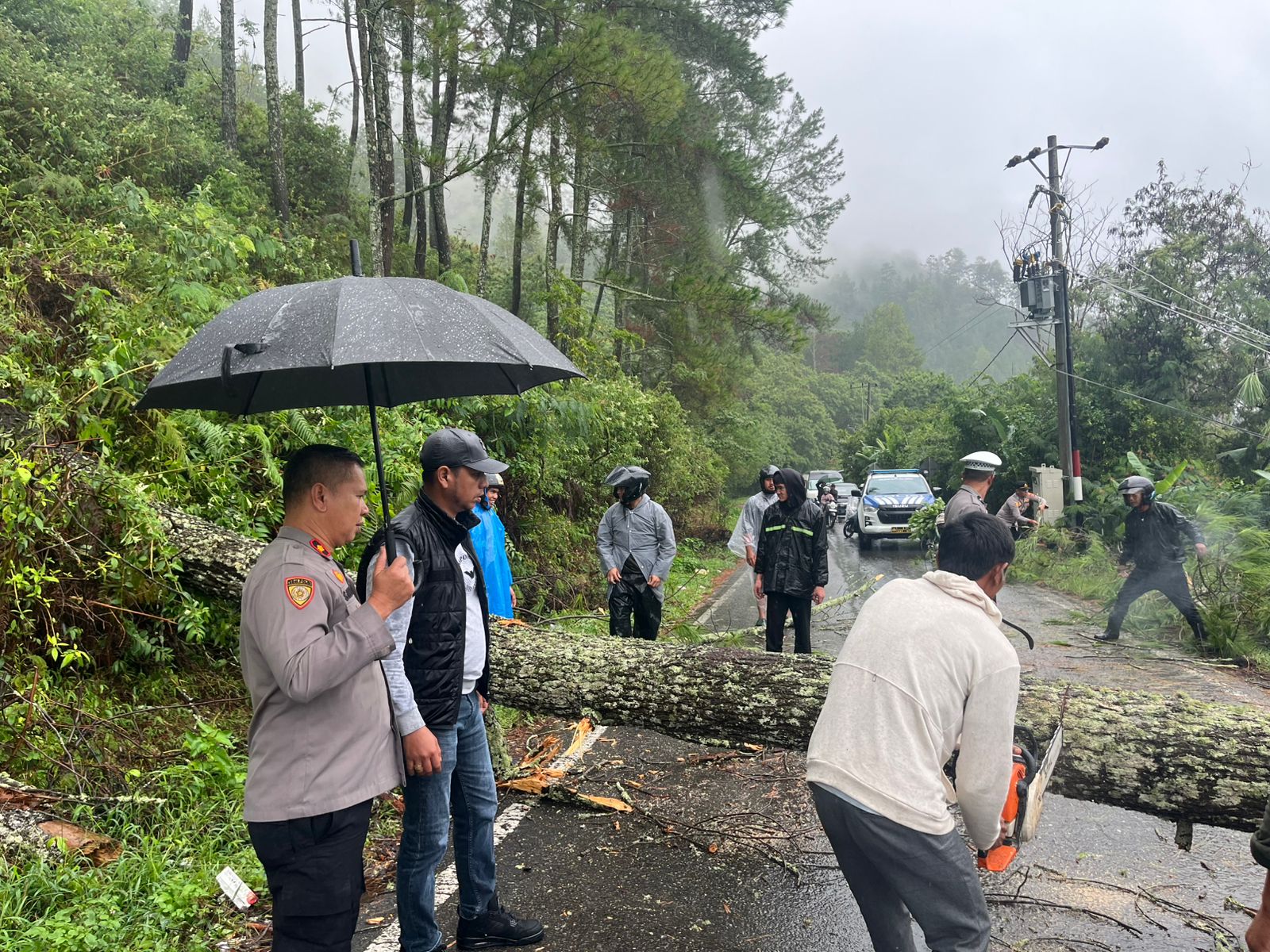 Personel Polres Aceh Tengah dengan sigap melakukan pembersihan batang pohon menggunakan parang dan melakukan pengaturan arus lalu lintas. Pohon tumbang juga diketahui menimpa kabel PLN, sehingga petugas menghubungi BPBD Aceh Tengah dan pihak terkait.