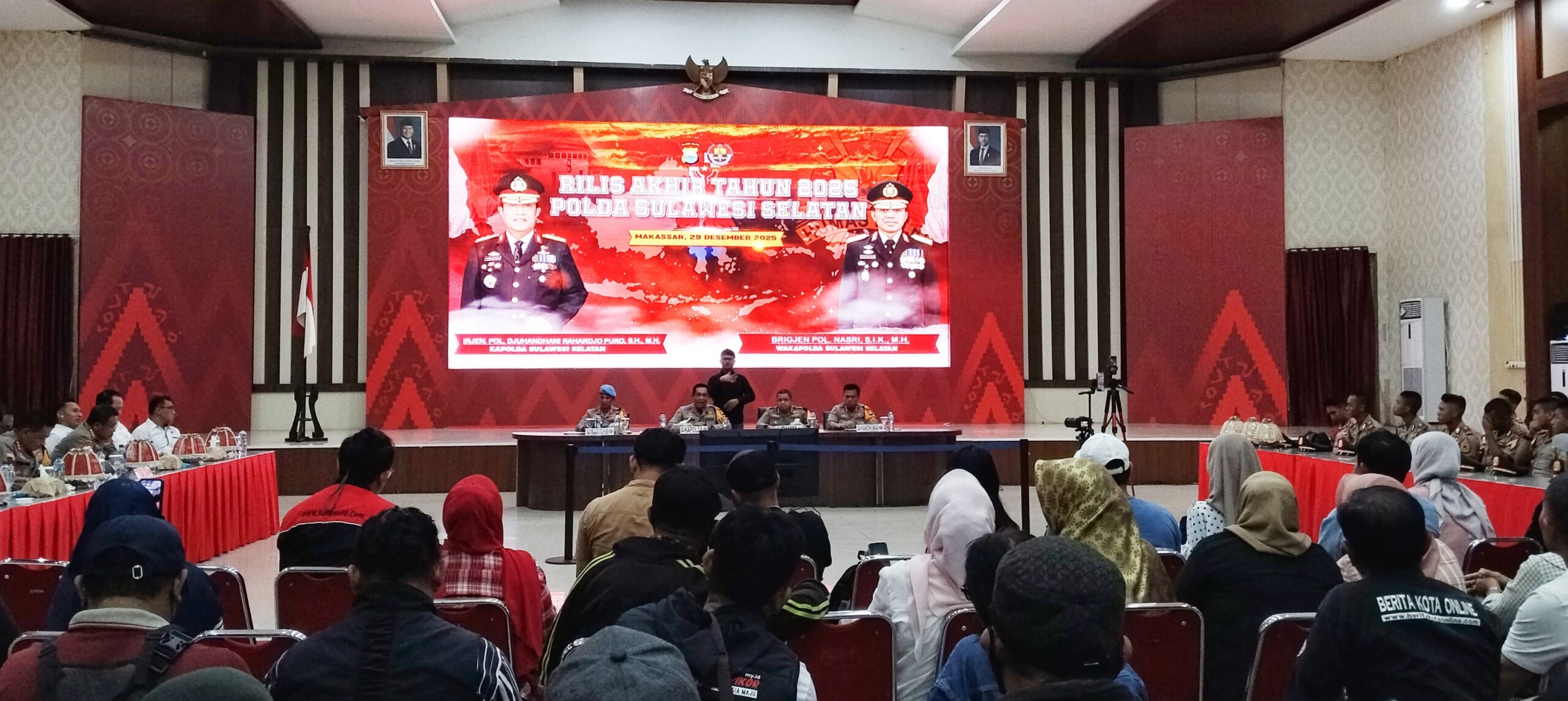 Rilis akhir tahun yang digelar di Aula Mappaoddang Polda Sulsel, Makassar, Senin (29/12/2025), dipimpin langsung Kapolda Sulsel Irjen Pol. Djuhandhani Rahardjo Puro.