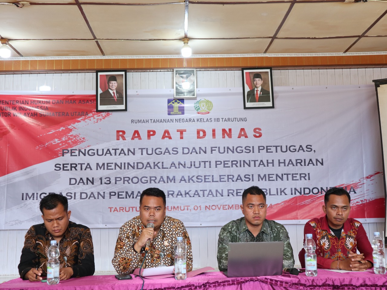 Rumah Tahanan Negara (Rutan) Kelas IIB Tarutung menggelar sosialisasi mengenai Asta Cita Presiden Bapak Prabowo Subianto dan Wakil Presiden Bapak Gibran Rakabuming Raka, serta rapat dinas penguatan tugas dan fungsi sebagai bentuk menindaklanjuti perintah harian dan 13 program akselerasi Menteri Imigrasi dan Pemasyarakatan.
