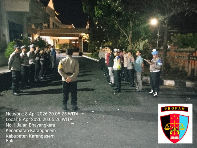 Sipropam Polres Karangasem melaksanakan pengecekan dan pengawasan giat serah terima tugas jaga piket fungsi pada malam hari. Kegiatan ini bertujuan menjaga kedisiplin dan profesionalisme anggota Polri dalam melaksanakan tugas khususnya pada malam harinya. Pada Rabu, 8 April 2026 pukul 20.00 Wita.