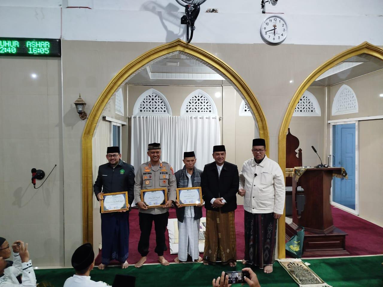 Sebagai wujud apresiasi, Kapolres turut menyerahkan cinderamata kepada pengurus Masjid Jami’ Al Muhajirin, serta bersilaturahmi dengan para tokoh dan masyarakat setempat.