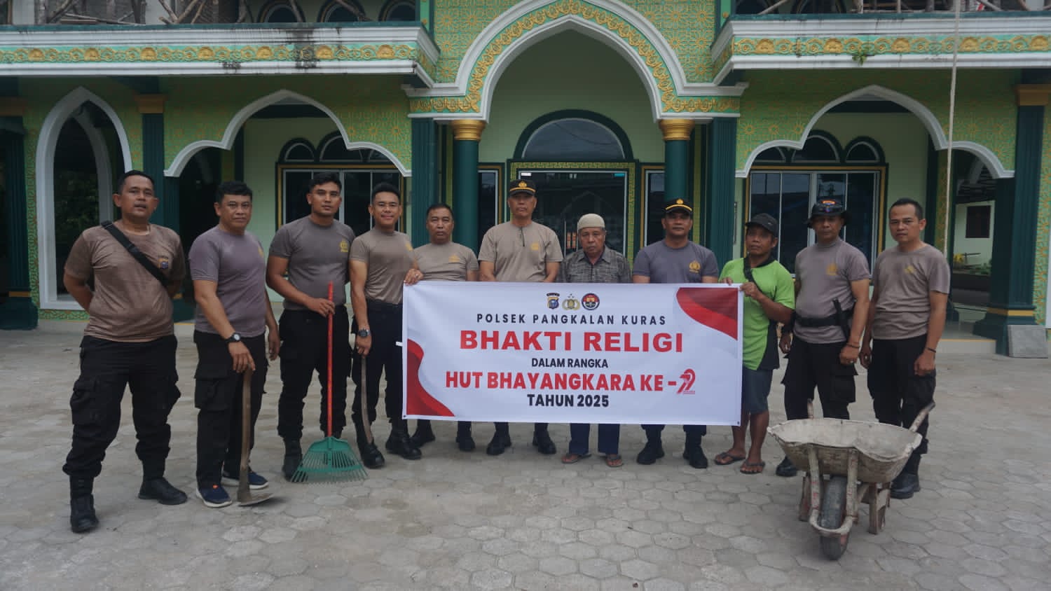 Dalam rangka memperingati Hari Ulang Tahun (HUT) Bhayangkara ke-79, Polsek Pangkalan Kuras melaksanakan kegiatan Bakti Religi di Masjid Al-Jamiatur Rahmah yang berlokasi di Kampung Mulya Baru, Kelurahan Sorek Satu, Kecamatan Pangkalan Kuras, Rabu (18/6/2025).