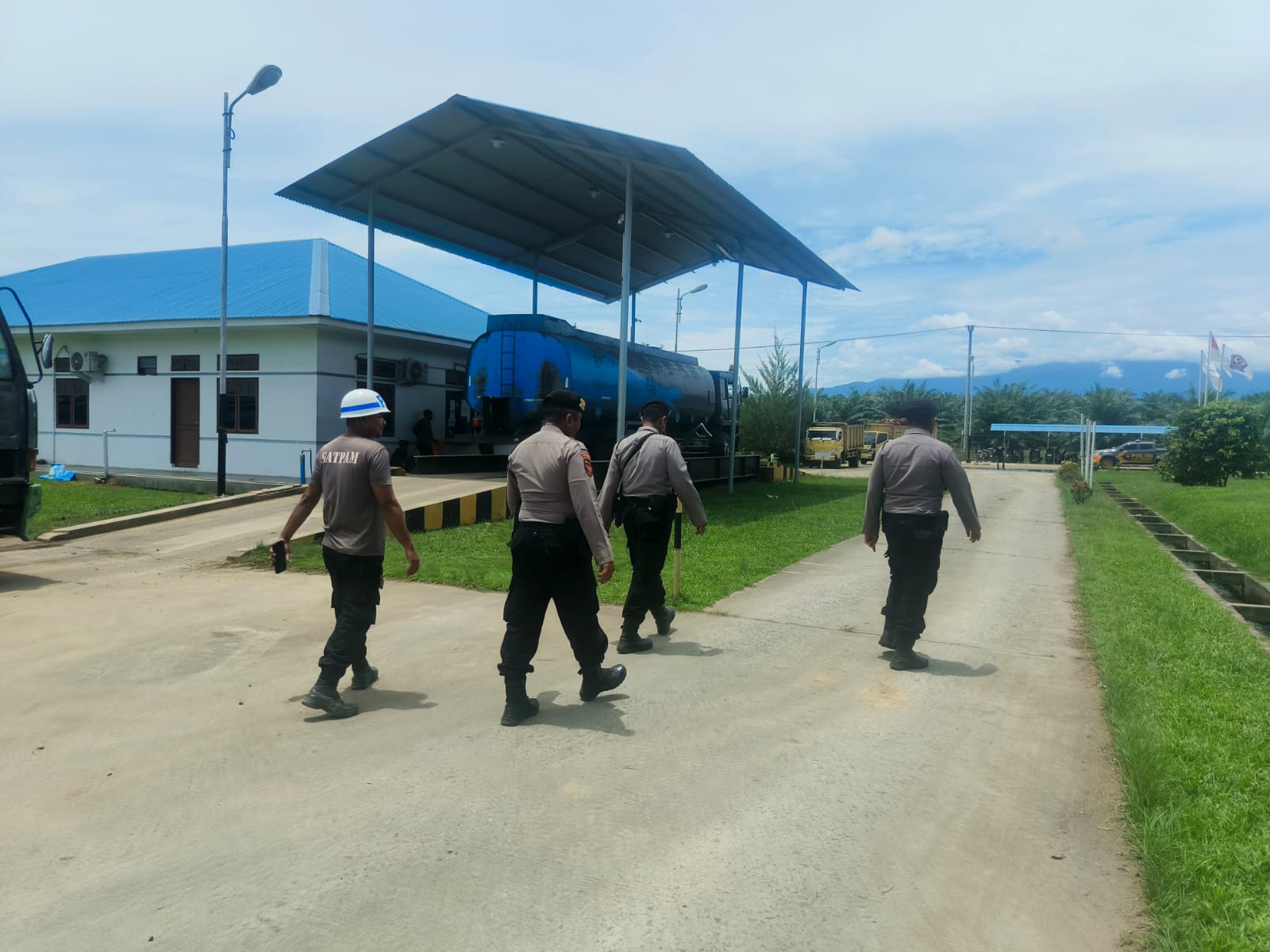 Personel Satuan Pengamanan Objek Vital (Sat Pamobvit) Polres Lhokseumawe melaksanakan patroli di kawasan PT Satya Agung, Desa Meunasah Dayah, Kecamatan Simpang Keuramat, Kabupaten Aceh Utara, Rabu (3/9/2025) pagi.