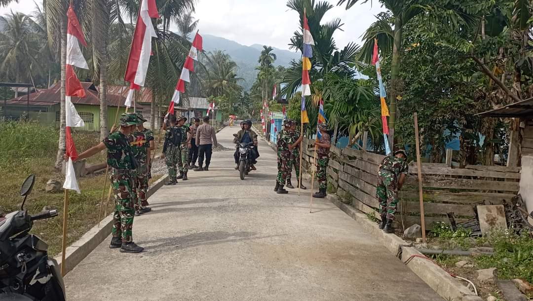 Bersama warga Satgas TMMD Reguler Ke 121 Kodim 0119/BM mengajak masyarkat melaksanakan gotong royong dan pemasangan umbul-umbul sambut HUT Kemerdekaan RI ke 79 tahun Desa Blang Panu, Kecamatan Syiah Utama, Kabupaten Bener Meriah, Sabtu (10/08/2024).
