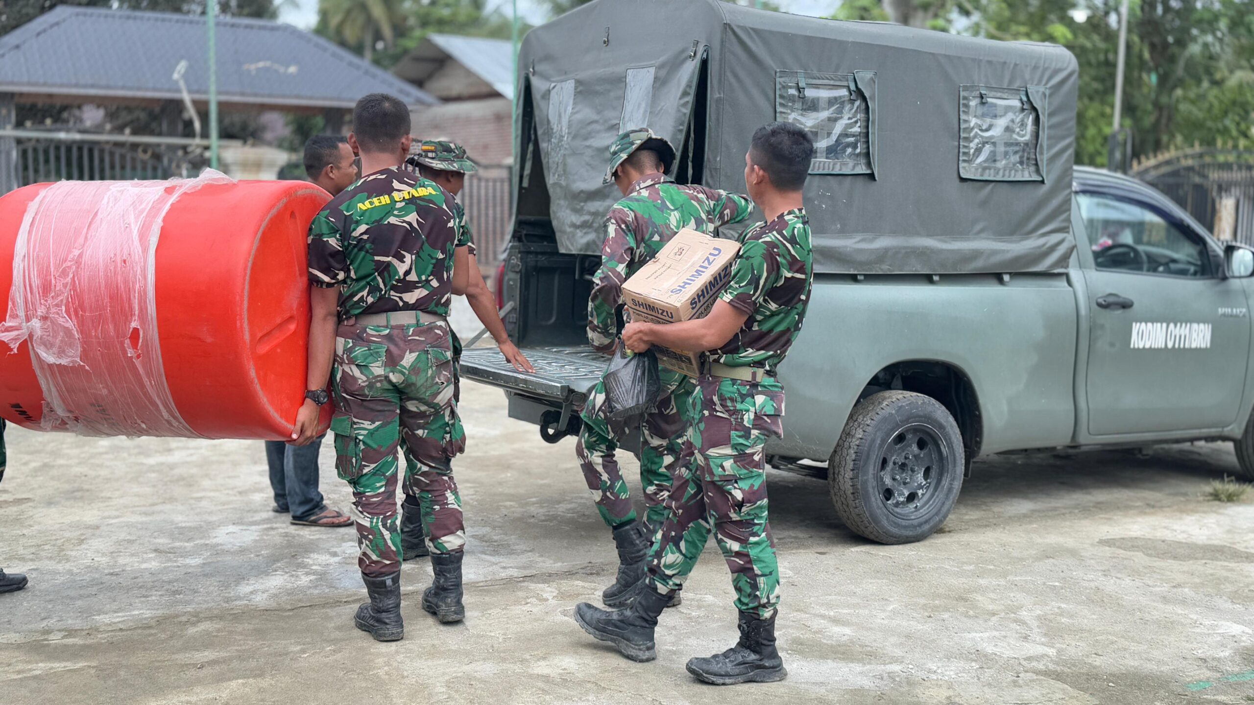 Dalam rangka mendukung keberhasilan program TNI Manunggal Membangun Desa (TMMD) Ke-123, anggota Satuan Tugas (Satgas) TMMD Kodim 0111/Bireuen melaksanakan pengangkutan dan distribusi peralatan guna pembangunan sarana air bersih di desa sasaran. Sejumlah personel TNI tampak memindahkan tandon air dan perlengkapan lainnya ke kendaraan operasional sebelum dikirim ke lokasi. Sabtu (15/03/2025).