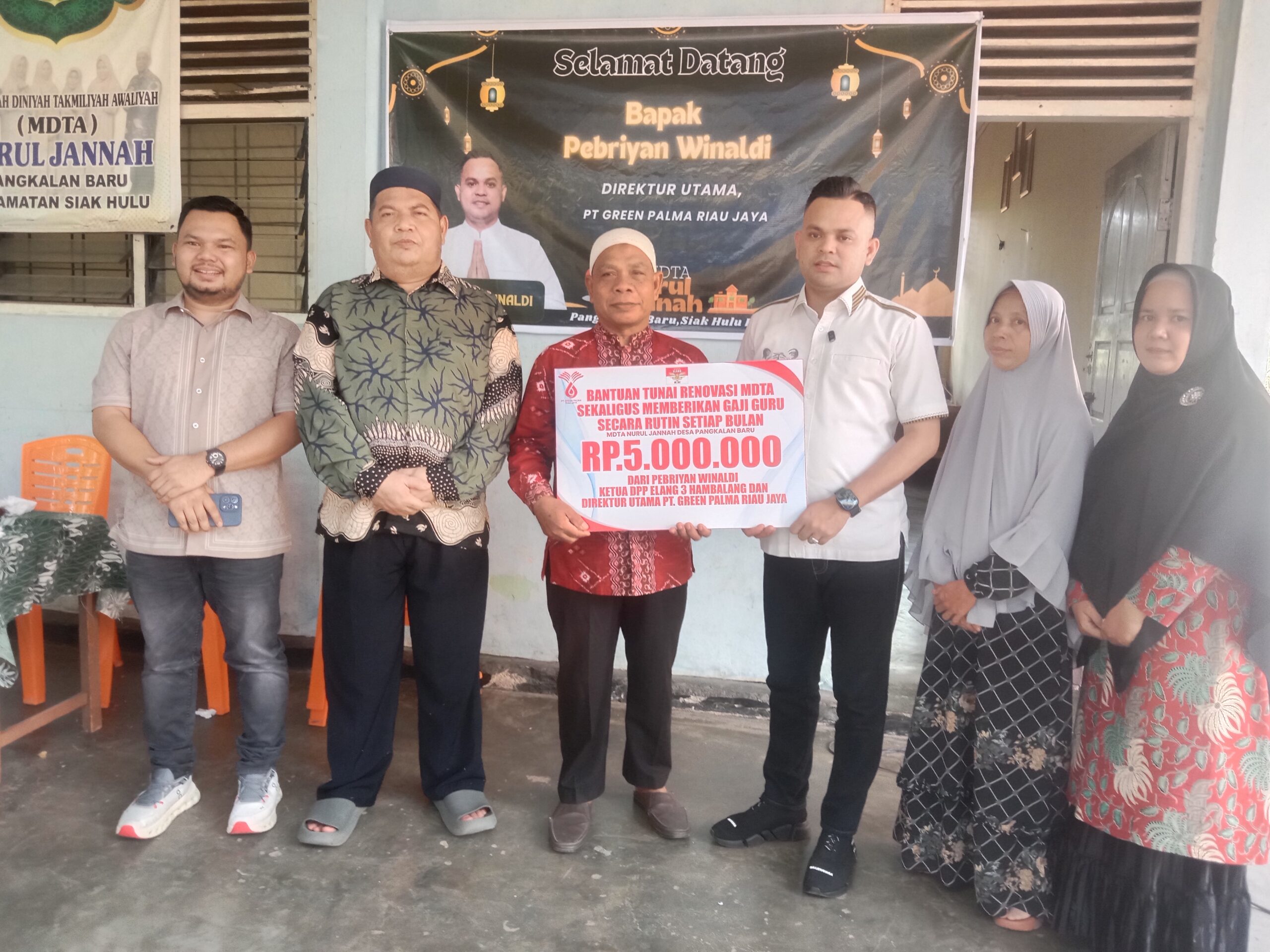 Program bantuan pembangunan renovasi sekolah sebesar 5 Juta Rupiah dan juga memberikan honor guru pengajar tiap bulan sebesar 1.7 juta tiap bulan dari Direktur Utama PT Gren Palma Jaya Riau dan Ketua DPP Elang 3 Hambalang Sekaligus Kader Partai Gerindra Pusat Pebriyan Winaldi berhasil menghadirkan kebahagiaan di wajah para siswa/i Madrasah Diniyah Takmiliyah Awaliyah (MDTA) Nurul Jannah, Desa Pangkalan Baru , Kecamatan Siak Hulu, Kabupaten Kampar Riau. Kamis, (22/01/26)