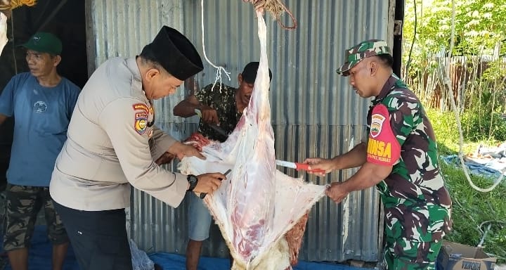 Sinergitas antara TNI dan Polri di Kelurahan Sorek Satu, Kecamatan Pangkalan Kuras, kembali ditunjukkan melalui kegiatan sosial berupa pemotongan hewan kurban, Sabtu (7/6/2025).