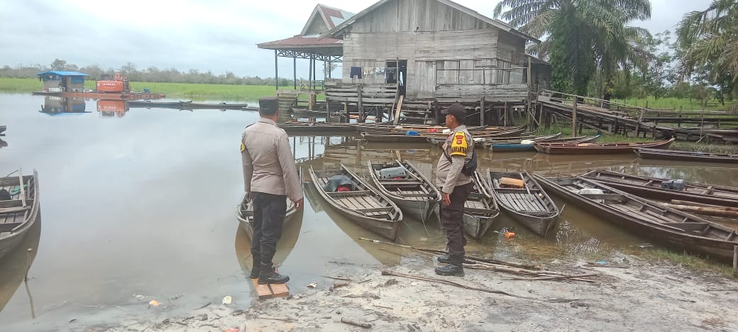 Personel Polsek Pangkalan Kuras melakukan patroli bantaran Sungai Nilo di Dusun 1, Desa Kesuma, Kecamatan Pangkalan Kuras, Senin, 5 Januari 2026. Kegiatan ini digelar untuk memantau dan mencegah potensi banjir di wilayah hukum Polsek Pangkalan Kuras.