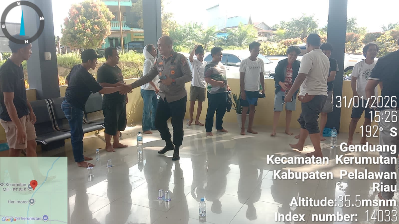 Kapolsek Kerumutan, Iptu Budi Santoso, memediasi perwakilan pemuda Desa Bukit Garam dengan manajemen PT Sari Lembah Subur (SLS) terkait belum beroperasinya pabrik perusahaan tersebut. Mediasi berlangsung di Aula Pabrik PT Sari Lembah Subur, Kecamatan Kerumutan, Kabupaten Pelalawan, Sabtu, 31 Januari 2026.