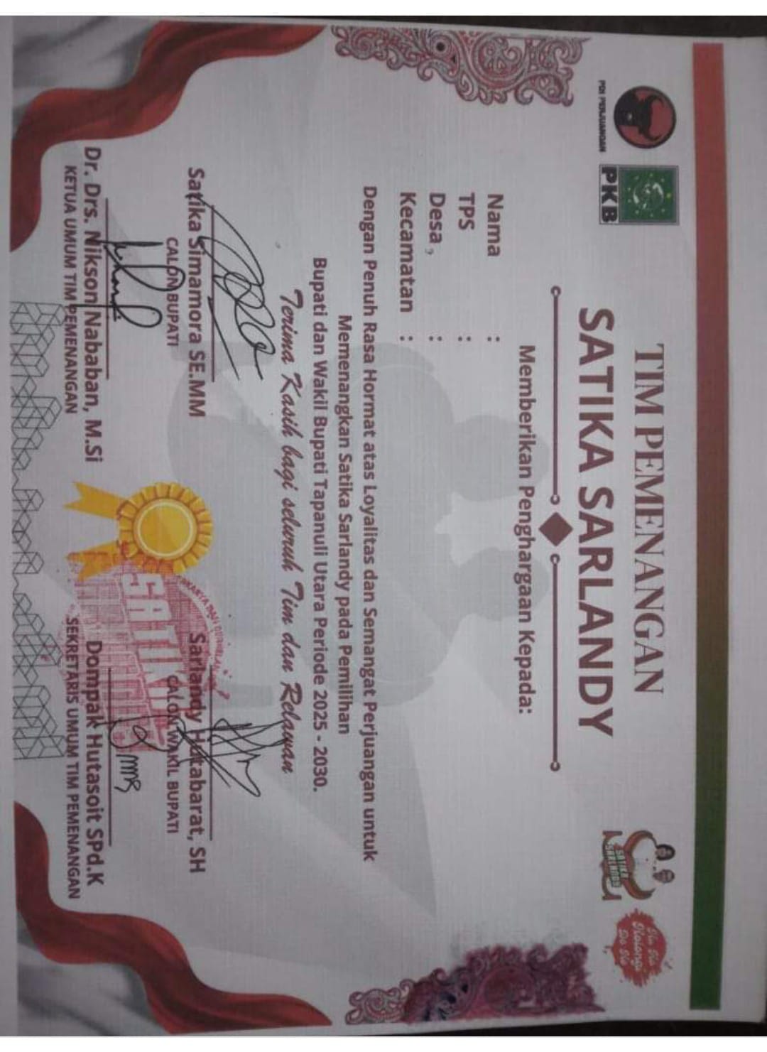 Sejumlah warga penerima sertifikat.mengatakan kalau pilkada kali ini lebih berat buat Satika. dari calon yang lain. Alasannya Satika dinilai ‘rakus’ jabatan dimana Suaminya Nikson Nababan sudah dua periode sebagai Bupati Taput.