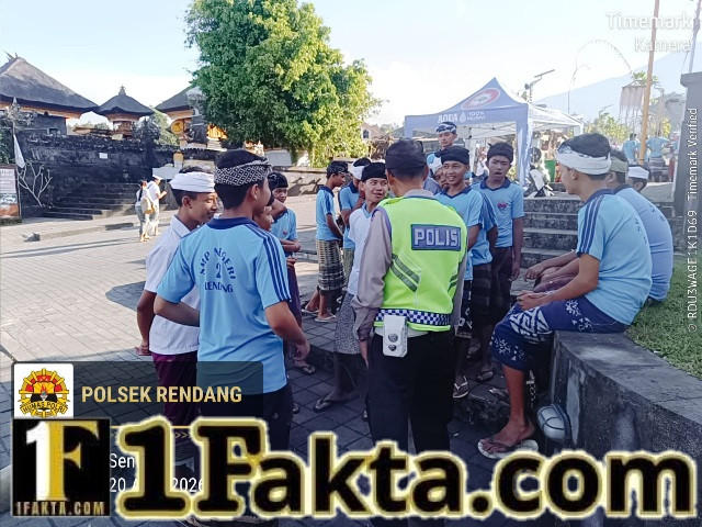 Ka Posko Manik Mas AKP I Wayan Suberata, SH., bersama anggota jaga dialogis dengan anak-anak sekolah yang akan melaksanakan ngayah bersih-bersih di Pura Besakih guna menyampaikan pesan kamtibmas. Pada Senin, (20/4/2026).