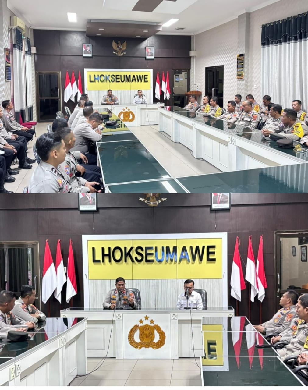 Tampak Waka Polres Lhokseumawe Kompol Salmidin, S.E., M.M. memimpin sesi awal dengan memberikan arahan terkait analisa dan evaluasi pelaksanaan fungsi Binmas di lapangan. Ia menekankan pentingnya peran Kanit Binmas dan Bhabinkamtibmas dalam menjaga situasi kamtibmas yang kondusif di desa binaan masing-masing.