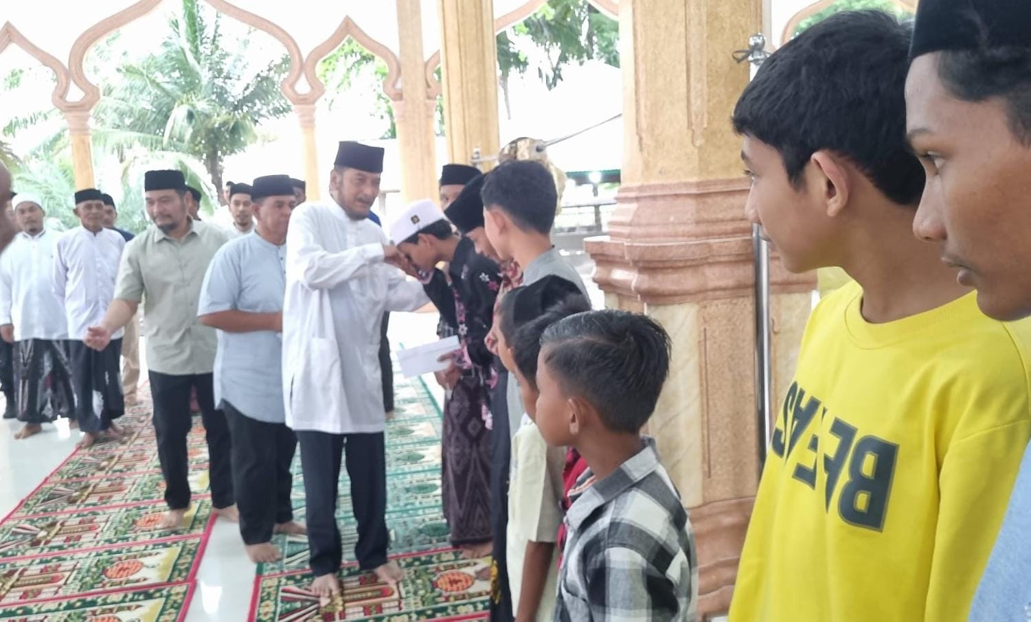 Menjelang berbuka puasa, Wakil Bupati menyerahkan santunan kepada sejumlah anak yatim dari sejumlah gampong kemesjidan Tgk Dilampoh di Kecamatan Peudada.