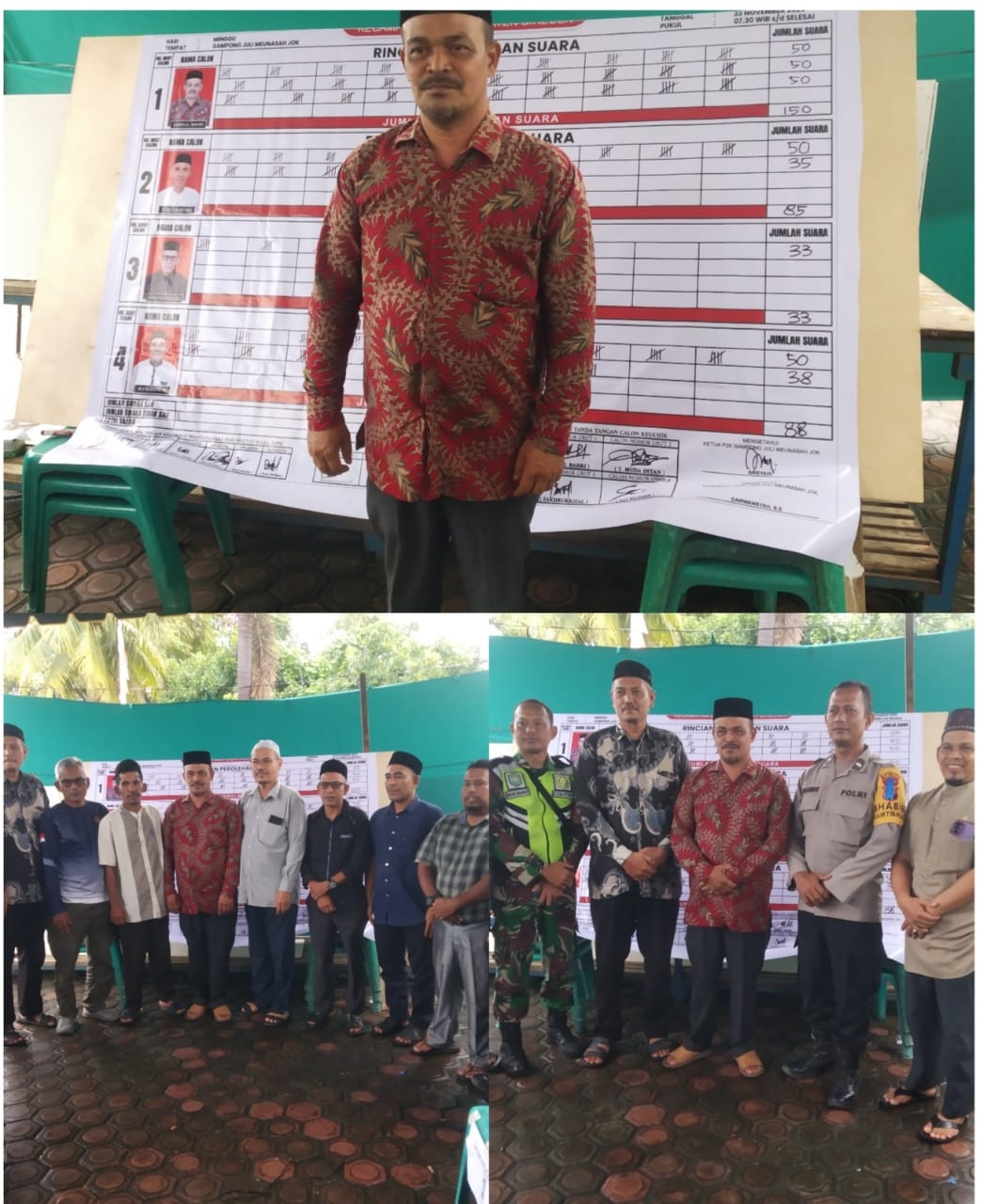 Samsul Bahri ,dengan nomor urut ,1:memperoleh suara,150,suara, dan nomor urut 2,hanya T,muda intan mendapatkan suara,,85,suara,sedangkan nomor urut 3,Fakhrurrazal mendapat kan suara 33,suara,nomor urut 4,Ali Nurddin,M,medapat kan suara 88,dinyatakan dengan perolehan suara terbanyak sebagai Keuchik Terpilih Desa juli meunasah jok periode 2025-2031,”
