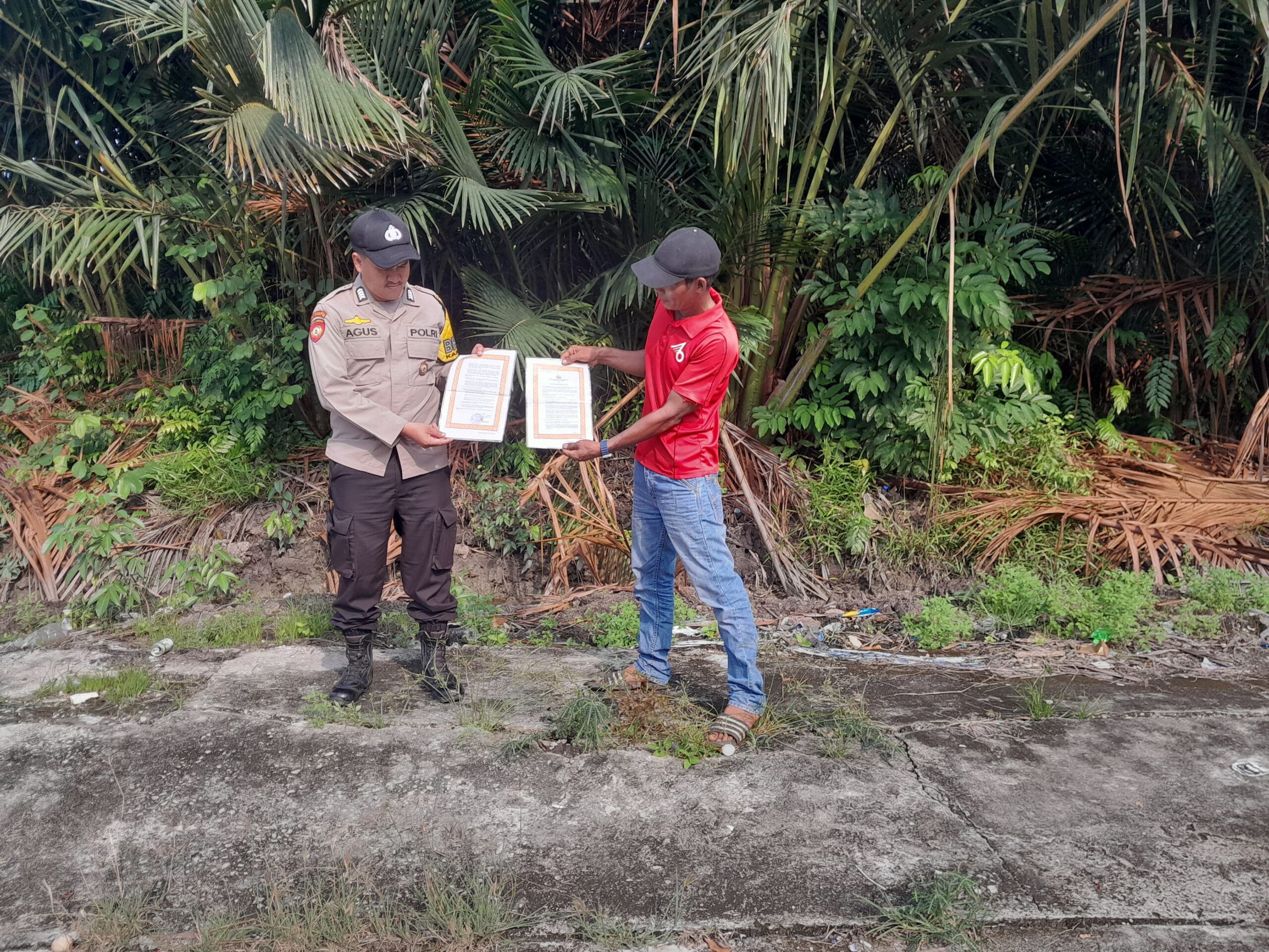 Personel Polsek Kuala Kampar melaksanakan sosialisasi dan penyebaran maklumat Kapolda Riau terkait larangan membuka hutan dan lahan dengan cara membakar, Minggu, 8 Maret 2026. Kegiatan ini digelar di Kelurahan Teluk Dalam, Kecamatan Kuala Kampar, Kabupaten Pelalawan.